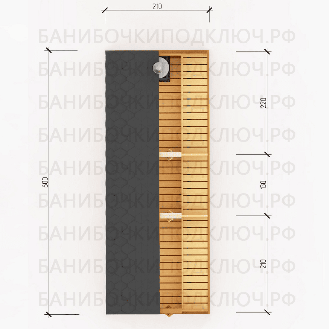парилка - 220 см, мойка - 130 см, предбанник - 210 см