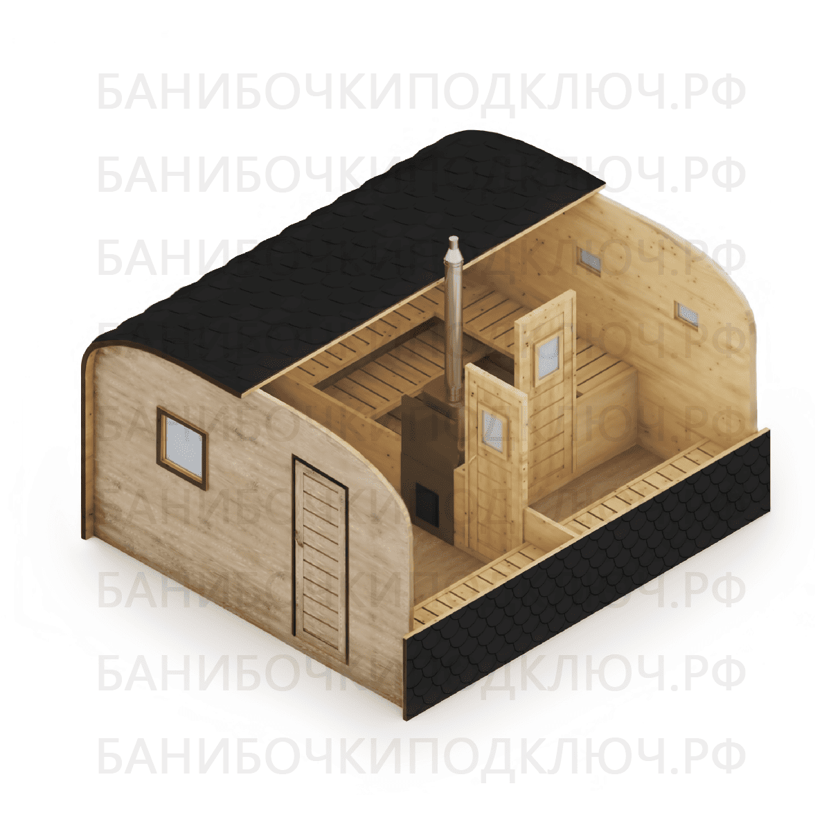 Баня Викинг 6 x 2,2 м с арочным входом и проходной мойкой